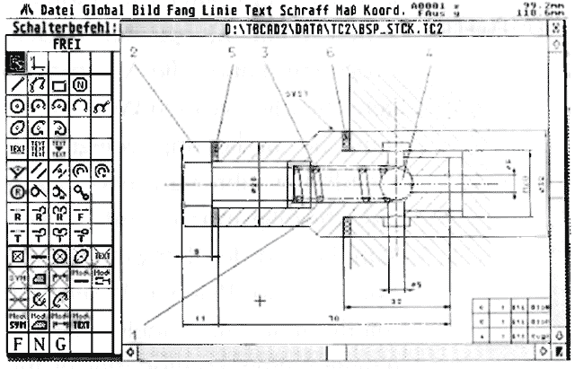 Das Programm Drafter der Firma Technobox ist schon vom Konzept her ein CAD-Programm, das sich zum schnellen und übersichtlichen Zeichnen eignet. Der Leistungsumfang fällt daher etwas bescheidener als bei dem weiter unten beschriebenen CAD/2 aus dem gleichen Hause aus. Mit dem Drafter lassen sich CAD-Zeichnungen in hervorragender Qualität bei guter Effektivität erzielen. Die Übersicht ist gegeben. Dem Anfänger stehen zu jedem Icon Hilfstexte zur Verfügung, so daß auch der unregelmäßige Umgang mit diesem Programm nicht lange aufhält. Bemerkenswert ist die Farbdarstellung und die Großbildschirm-Fähigkeit. TT-Anwender kommen ebenfalls auf ihre Kosten, und auch den Betrieb des Cache-Speichers nimmt das Programm nicht übel. Der Drafter dürfte für die meisten Standard-CAD-Anwendungen vollauf genügen und ist für mich in der mittleren Atari-CAD-Liga das Programm mit dem besten Preis-Leistungsverhältnis.