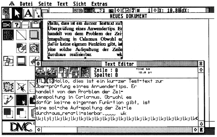 Man kennt es aus den Illustrierten: Am Ende eines Artikels prangt ein dicker Punkt. Oder das Beispiel Tageszeitung: Ein Kürzel am Ende des Textes läßt Rückschlüsse auf den Autor zu. Dabei ist es immer so, daß das Kürzel oder gar der ganze Name des Verfassers rechtsbündig gesetzt ist, während der Text des Artikels in der letzten Zeile linksbündig bleibt. Da ich mit Calamus eine Schülerzeitung setze, wollte auch ich mich der Kürzel bedienen. Eine leichte Sache mit Calamus - sollte man annehmen. Irrtum, denn weder Calamus 1.0x noch SL stellen eine Funktion zur »Zeilenspaltung« (so lautet wohl der Fachausdruck) bereit. Dennoch läßt sich das Problem mit folgenden Schritten lösen. Schalten Sie den Blocksatz ein und schreiben Sie den Text ganz normal im Texteditor. Lassen sie dann den Text in den Rahmen fließen. Nun erneut den Editor aufrufen. Der Text ist jetzt bereits richtig formatiert. In der letzten Zeile die gesamten Leerzeichen durch »feste« Leerzeichen (Space und Shift) ersetzen. Dann zwei normale(l) Leerzeichen einfügen, Steuerzeichen nach Belieben und den Namen oder das Kürzel eintippen. Nach einem weiteren Leerzeichen einen langen zusammenhängenden Nonsenstext eingeben, so daß auf jeden Fall ein Zeilenüberlauf entsteht. Zum Schluß den Text wieder in den Rahmen zurückfließen lassen und schon haben Sie eine perfekte Zeilenspaltung. Das Verhältnis von festen und normalen Leerzeichen in der letzten Zeile variiert dort übrigens noch den Wortabstand.