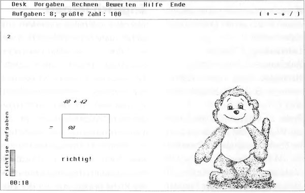 Eine der wichtigsten Übungen im Mathematikunterricht ist das Kopfrechnen. Doch beim Kopfrechnen in der Schule rechnet häufig nur ein Schüler, während sich der Rest der Klasse langweilt. Damit hält sich der Lernerfolg in Grenzen. Schön wäre es, jeden Schüler rechnen zu lassen und jeweils einen eigenen Kontrolleur für die Ergebnisse zu haben. Hier kommen der Computer und »Maki«, das Rechenäffchen ins Spiel. Für Schüler von Klasse 2 bis 5 läßt sich das Programm gut einsetzen, um das Kopfrechnen interessant und abwechslungsreich zu gestalten. Die Rechenarten und Schwierigkeit der Aufgaben lassen sich einstellen und zur Belohnung freut sich das Äffchen über die richtige Antwort oder ist traurig, wenn das Ergebnis nicht gestimmt hat und gibt sogar eine Rechenhilfe. Nach tüchtiger Übungsphase wird der Schüler noch mit einem kleinen Spiel beglückt, was zum weiteren Üben anspornt (vgl. Bild 7).