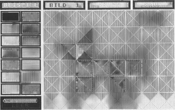 Super Kidgrid speichert bis zu 10 verschiedene Bilder. Außerdem läßt sich die Schöpfung auch drucken und anschließend noch mit Buntstiften anmalen. Dieses Computerprogramm findet viele Parallelen in Kinderspielen. Wenn mit Kunststoffknöpfen auf Plastikspielbrettern Figuren entstehen, dann steckt das gleiche Spielprinzip dahinter. Das Programm ist ein nettes, phantasieanregendes Spiel, nur vielleicht für diesen Zweck etwas zu teuer (vgl. Bild 2).