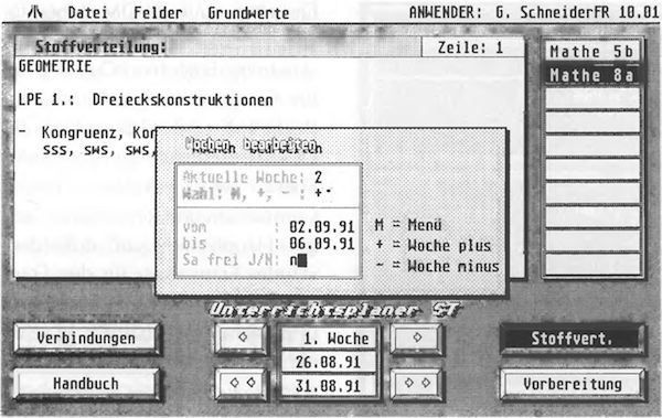 Zum Anlegen eines neuen Stoffplans muß man zuerst die Grunddaten wie Name, Schule, Schuljahr, Klasse und Datum eingeben. Diese Daten erscheinen bei einem Ausdruck stets als Kopftext. Anschließend ist für jede Woche Anfangs- und Enddatum einzugeben, wobei als Hilfe immer das vorangegangene Datum in der neuen Eingabezeile erscheint. Das ginge sicher komfortabler. Die Ferien muß man genauso angeben, zusätzlich sind noch die Nummern der Wochen davor und danach nötig. Im eigentlichen Stoffverteilungsplan warten für jede Woche 50 Zeilen darauf, daß man sie mit Text füllt. Den gleichen Umfang hat ein Wochenfeld im Vorbereitungsteil, das damit nur selten die Vorbereitung für eine ganze Woche aufnehmen kann. Zwischen beiden Teilen schaltet ein Mausklick um. Für das Einträgen stehen eine Reihe von Editierfunktionen einschließlich Blockoperationen zur Verfügung. Dazu gehören auch das Kopieren von einem Feld in ein anderes oder der Ausdruck von Textteilen. Sehr nützlich sind die Verschiebefunktionen ganzer Felder oder Wochenpläne, mit denen sich der Stoffplan immer wieder der Realität anpassen oder auch leicht komplett umstrukturieren läßt. Die vorliegende Version 2.0 speichert komplette Pläne, aber auch einzelne Felder oder ganze Fächer (vgl. Bild 10).