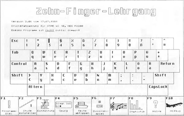 Das Programm verspricht, die Tage der Zwei-Finger-Akrobatik durch hartes Training zu beenden. Tröstend, auch der Programmautor hat noch seine Tipp-Probleme, denn die Umschlagsüberschrift lautet »Schreibmaschienen Lernprogramm«.