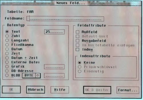 Zur Anlage eines Feldes ziehen Sie das Feldsymbol in die Tabelle. Ktierauf öffnet sich ein Feldfenster (vgl. Bild 2), in dem Datentyp, Attribute und eventuell Formatangaben zu definieren sind. Flf Datentypen stehen zur Verfügung, von Text bis Blob. Der Typ »externe Datei« ist nötig, falls Sie Dateinamen (mit voller Pfadangabe) in die Maske übernehmen wollen. Für diesen Fall sind bestimmte Dateiendungen (.gern, .img, .sam, .) vorgeschrieben. Der Typ »Grafik« ist für das feste Ein binden von Bildern vorgesehen. Interessant ist der Typ »Blob«. Er dient zur festen Einbindung von Bit-, Wort- oder Langwort-Folgen, wie sie z.B. für Sprache oder Musik nötig sind. Und noch ein Datentyp ist außergewöhnlich: »DB-Adresse«. Zur Zeit wird er nur intern für das sequentielle Sortieren benutzt, das muß aber nicht so bleiben.