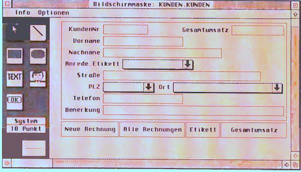 Mit dem Designer entwerfen Sie neue Datenbanken oder ändern vorhandene. Die Arbeit mit ihm ist gewöhnungsbedürftig, dafür steckt er voller Überraschungen und erlaubt Dinge, die Sie auf dem PC-Markt suchen können. Ähnlich komfortable Datenbanken lassen sich wohl nur noch mit dem Macintosh anlegen. Datenbanken werden in Fenstern entworfen, die am linken Rand eine Toolbox mit allen erforderlichen Elementen und im Kopf eine Leiste für PopUp-Menüs enthalten. Sie dürfen mehrere Datenbanken gleichzeitig bearbeiten. Dann hat jedes Fenster seine eigene Toolbox. Komplizierte Datenbankstrukturen passen zwar in ein Fenster, sind dann aber oft nicht komplett sichtbar. Hat man keinen Großbildschirm, muß man vertikal oder horizontal scrollen (vgl. Bild 1). Aus diesem Grund fände ich persönlich eine einzige Toolbox günstiger, die für alle Fenster gilt und auf Wunsch auch vom Datenbankfenster überdeckt werden darf.