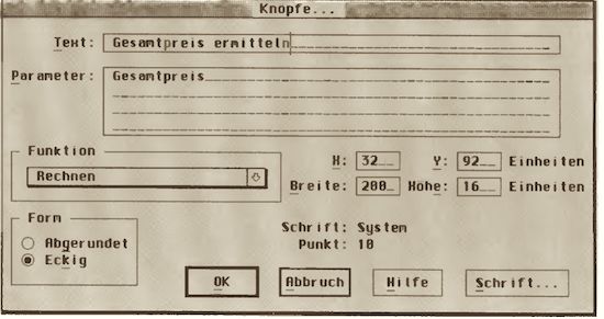 Der absolute Clou sind aber die Aktionsknöpfe. Hierzu dient das OK-Sinnbild der Toolbox. Der Knopf wird mit der Maus auf die vermutete Größe gezogen, anschließend erscheint eine Dialogbox (vgl. Bild 4), in der alle notwendigen Definitionen einzutragen sind. Text erhält die Knopfbezeichnung, Parameter die auszuführende Aktion. Diese darf auch in einer Prozeßdatei beschrieben sein. Die zugehörige Funktion wird mit einer Pop Up- Listbox eingestellt. Vorgesehen sind 26 Einzelfunktionen, von Einfügen bis Verzweigen. Diese Knopf-Funktion ist wirklich überzeugend. Bei der Größeneinstellung von Rahmen und Knöpfen wünschte ich mir, daß ein nachträgliches Ändern mit der Maus möglich wäre, vergleichbar ähnlichen Routinen in Zeichenprogrammen. Statt dessen muß man bisher solche Änderungen in Form neuer Absoluteingaben für Höhe und Breite bewerkstelligen. Das ist etwas lästig.