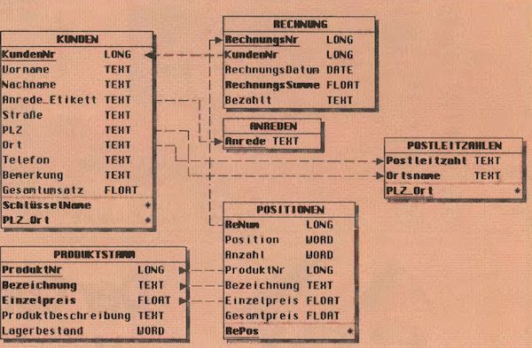 Bei den Attributen fällt »Ausgabefeld« auf. Solche Felder sind für die Eingabe gesperrt, falls sie nämlich intern errechnete Daten aufnehmen sollen, die für das Editieren zu sperren sind. Das Attribut »in Wertetabelle einfügen« bedeutet, daß eine Eingabe in so ein Feld automatisch auch in das verbundene Feld einer anderen Tabelle kommt. Primärschlüssel dürfen in einer Datei genau einmal Vorkommen, um Datensätze eindeutig zu definieren. Eine Postleitzahl darf in einer PLZ-Tabelle Primärschlüssel sein, nie aber in einer Adress-Tabelle. »Eindeutig« ist ein Analogon zu »Primärschlüssel«, mit dem Unterschied, daß sich Datensätze darüber nicht eindeutig definieren lassen. Mittels »Format« ordnet man Feldern bestimmte Ein/Ausgabeformate zu, etwa DD.MM.YY, DD.Month.YYYY, 99.9999,00, Aa...a, .* 0,00 usw. Ein besonderer Index ist der Multi-Index, in der Toolbox als Schlüsselpaar dargestellt. Mit ihm stellen Sie zwischen Tabellen Verbindungen her, die aus Bestandteilen mehrerer Felder bestehen. Die Definition erfolgt in einer eigenen Dialogbox. Den Tabellen dürfen eigene Sinnbilder zugeordnet sein, den Feldern unterschiedliche Schriftarten, -attribute und -großen. Außerdem lassen sich Dokumentgrößen frei variieren und Zugriffsrechte nach Benutzern auf Tabellen bzw. Felder festlegen.