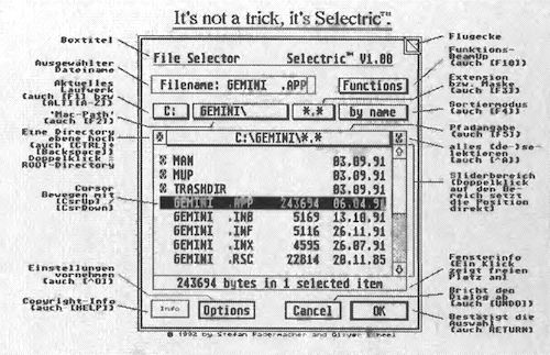 Es besteht eigentlich kein Zweifel: Bei der Konzeption der Fileselect-Box der Ataris hatten die Entwickler ständig obiges Motto im Hinterkopf. Da überrascht es nicht, wenn sich viele Anwender eine eigene komfortable Dateiauswahl-Box programmieren.