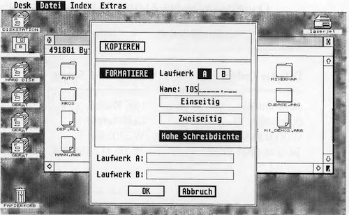 Zum SchluĂ mĂŒssen Sie noch an der Dip-Reihe Dip-Schalter 7 umlegen. Bauen Sie nun wieder alles zusammen. Nach dem Einschalten meldet sich der Rechner jetzt mit dem Atari-Symbol und einem Speichertest, den Sie mit der Eingabetaste abbrechen können. Im MenĂŒeintrag »Formatieren« befindet sich jetzt die zusĂ€tzliche Auswahl-Box »hohe Schreibdichte« fĂŒr HD-Disketten.
