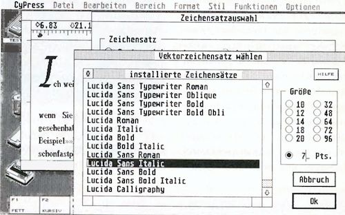 Das herausragende neue Feature ist sicher die Unterstützung von FSM-GDOS, dem neuen Vektorschriftensystem von Atari. FSM-GDOS selbst gehört, zumindest zunächst, nicht zum Lieferumfang von CyPress. Es soll über die Atari-Händler aber den Anwendern zugänglich sein, und zwar, so der letzte Stand der Dinge, voraussichtlich kostenlos. Die Schriften, also der Lebenssaft von FSM-GDOS, sind bereits in reicher Auswahl und guter Qualität vorhanden. Der Preis pro Schriftfamilie dürfte sich im Bereich von zwanzig bis dreißig Mark bewegen. Damit kann man sich relativ preiswert genau die Schriften zusammenkaufen, die man haben möchte. Doch zurück zu CyPress. Nach der Installation von FSM-GDOS arbeitet das Programm praktisch mit drei verschiedenen Fonttypen zusammen. Da ist zunächst der Systemfont, der sich ja über entsprechende Utilities ebenfalls ändern läßt. Dieser Font kommt sowohl im schnellen Editor-Modus als auch auf dem ersten Platz der Fontliste im Dokumenten-Modus zum Einsatz.