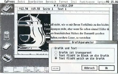 CyPress zeigt sich nun im typisch modernen GEM-Gewand mit verschiebbaren, tastaturbedienbaren Dialogboxen. Die positive Folge: Das Programm läuft auflösungsunabhängig in allen Bildschirmformaten. Die Tastaturbedienung der Funktionen hält sich weitgehend an die auf anderen Systemen üblichen Standards und ist leicht eingängig.