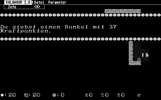 Sollten Sie einem übermächtigen Feind begegnen, können Sie ihn auch in eine Fallgrube locken. Diese liegen jedoch sehr unauffällig versteckt und wenn Sie nicht sehr ufpassen, fallen Sie selbst hinein. Obgleich Kalawaum sehr einfach gestaltet ist, fällt es doch sehr schwer, mit dem Spielen aufzuhören. Unserer Meinung nach kann man dieses Programm durchaus in die Reihe der Kult- und Suchtspiele einordnen. Kalawaum läuft nur in der monochromen ST-Auflösung und ist Public Domain. Sollten Sie aber daran Gefallen finden, können Sie für 20 Mark beim Autor neue Bilder erhalten.