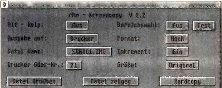 Doch nicht immer ist es sinnvoll, den Bildinhalt direkt auf Papier zu bannen. Häufig möchte man den Bildschirmsnap in einem Grafikprogramm weiterbearbeiten. Deshalb lassen sich auch alle Hardcopies, ob ganz oder nur ein Ausschnitt, in eine Datei umleiten. Der Name und Pfad ist zuvor festzulegen. Auf Wunsch versieht rhocopy den Dateinamen auf den letzten drei Stellen mit fortlaufenden Nummern. Das gespeicherte Format ist IMC. In diesem Zusammenhang bietet es sich an, entsprechende IMG-Dateien mit rhocopy auch wieder darzustellen. Das Tool verwendet dazu ein Fenster, so daß auch die Darstellung großer Dateien auf einem SM124/146 möglich ist. Gewöhnungsbedürftig ist allerdings die Tatsache, daß der Hintergrund von rhocopy genau wie der Desktop aussieht. Grau vor grauem Hintergrund findet sich nicht so besonders gut. Trotzdem, wer auf gute Ausgabequalität seiner Hardcopies Wert legt, der findet in rhocopy das geeignete Hilfsmittel dafür. (S.Lucifora/wk)