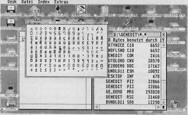 Das Accessory »Flying Letters« schafft Abhilfe. Es bietet Ihnen eine ständig verfügbare ASCII-Tabelle, aus der Sie bequem das gewünschte Zeichen in das gerade aktive Programm übernehmen - ganz gleich ob Textverarbeitung, Editor oder Desktop Publishing. »Flying Letters« arbeitet in allen Auflösungen und mit allen GEM-Applikationen, die konforme Tastaturfunktionen verwenden.