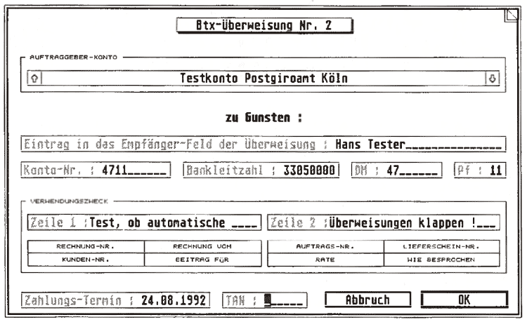 Seitdem die Preise für ein Modem kaum noch das monatliche Taschengeld eines Computeranwenders übersteigen, haben sie eine deutliche Verbreitung erfahren. Eine sinnvolle Anwendung für diesen Spielgefährten des braven Hauscomputers ist der elektronische Datentransfer per BTX. Von der Reservierung einer Bahnkarte bis zum Auftrag für das Versandkaufhaus läßt sich vieles mit BTX von zu Hause erledigen. Eines der gefragtesten Angebote ist dabei die Kontoführung. So lassen sich Überweisungen tätigen, Daueraufträge einrichten etc. Damit sich die Geldtransaktionen auch in Ruhe vorbereiten lassen, kommt aus dem Hause Drews die Software »Bank online«.