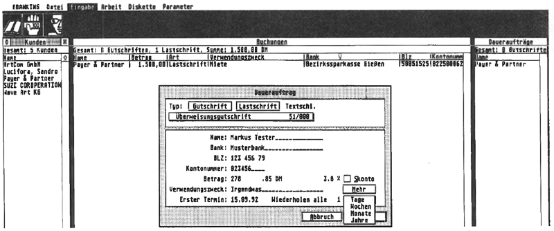 Wer häufig viele Überweisungen oder Lastschrifteinzüge bei seiner Bank einreichen muß, der kennt das lästige Ausfüllen der Belege. Da auch jede Bank mit einem Computer arbeitet, muß der Bankangestellte die Informationen von den Belegen wieder eintippen. Damit Sie als Bankkunde, aber auch der Bankangestellte weniger Arbeit haben, gibt es seit geraumer Zeit die Möglichkeit des »Beleglosen Datenträgeraustausches«. Das heißt, daß Sie in Ihrer Bank statt eines Stapels Belege eine Diskette mit all Ihren Überweisungs- und Lastschriftdaten abgeben. Da die Daten auf der Diskette natürlich in einer fest vorgegebenen Form vorliegen müssen, bietet die Firma IDEART mit »Electronic Banking« eine Software an, die Ihnen bei der Eingabe der Daten hilft und diese ordnungsgemäß speichert. Nachdem Sie Electronic Banking Ihre Daten mitgeteilt haben, geben Sie zunächst Ihre wichtigsten Überweisungs- und Lastschriftempfänger ein. Jetzt steht den Überweisungen nichts mehr im Wege. Bei der Eingabe von Überweisungen und Lastschriften läßt sich zwischen dem einmaligen Buchen und einem Dauerauftrag wählen. In der entsprechenden Eingabemaske müssen Sie nur den Namen Ihres Empfänger eingeben. Wildcards sind auch erlaubt. Haben Sie noch den Betrag, Verwendungszweck und Datum eingetragen, ist die Eingabe fertig. Beim Dauerauftrag läßt sich noch der Zyklus zwischen jedem Tag über Woche und Monat bis zu einmal im Jahr auswählen. Electronic Banking erinnert Sie dann bei jedem Programmstart an die fälligen