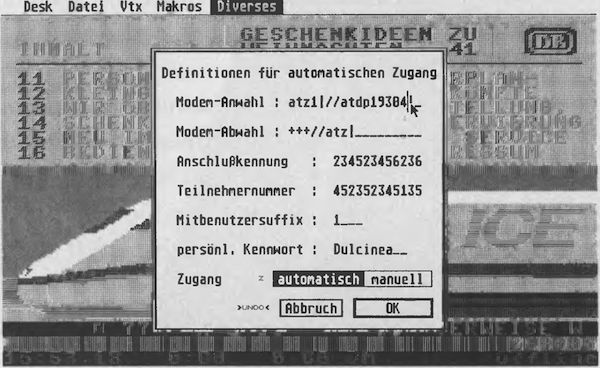 Langsam ist Btx durch die zumeist ĂŒberflĂŒssigen Farbinformationen. Deshalb erkennt das neue System beim Einloggen, ob es sich um den CEPT 1, den CEPT 2 Standard oder um ein VT100-Terminal handelt. Bei der letzgenannten Betriebsart gibt es dann die schnellen, allerdings farblosen ASCII-Seiten. Ferner gelangt man dann auch in das Datex-P-Netz. WĂ€hrend einer Btx-Sitzung lĂ€Ăt sich ĂŒber Seite *709 einfach die Betriebsart wechseln. Eine verbesserte KĂŒrzelsuche fĂŒhrt schneller zur gesuchten Seite. Doch auch am anderen Ende der Strippe, bei Drews in Heidelberg, hat sich etwas getan. Der Btx/Vtx-Manager prĂ€sentiert sich jetzt in der neuen Version 4.01. Das Programm lĂ€uft auf allen ST, STE und TT, in Farbe und Monochrom, sogar Grafikkarten finden UnterstĂŒtzung. Erfreulich schnell ist der Bildaufbau, das schont die Telefonrechnung. Das Programm arbeitet wahlweise mit Hayes-kompatiblen Modems oder der Btx-Anschaltbox der Post. In einer speziellen Konfigurations-Box stellen Sie alle Modemparameter wie Geschwindigkeit, Anwahlstring und Nummer ein. Sogar an einen 9600-Baud-Zugang dachten die Programmierer. Vielleicht geschehen bei der Post doch noch Wunder...