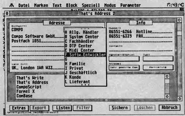 That's Address hatte bisher immer den Ruf eines Zubehörs für That's Write. Wer diese Textverarbeitung benutzt, der bleibt bei der Verwaltung seiner Adressen gleich im Hause und nimmt That's Adress, auch wenn diese Adressverwaltung nicht unbedingt das Optimum seiner Art war. Nun hat sich Compo aber offensichtlich vorgenommen, diese Einschränkungen in jeder Hinsicht zu beseitigen. Das neue That's Address 2 präsentiert sich als Software zur Adressen- und Informationsverwaltung allerbester Güte. Von der Oberfläche über die Gesamtorganisation bis zu den Detaillösungen überrollt es den Anwender mit Neuerungen. Schauen wir uns die Details genauer an. That's Address 2, kurz TA2 genannt, existiert in zwei verschiedenen Versionen, einmal als Accessory, wie bisher schon gewohnt. Außerdem gibt es aber noch eine Programm-Version. Diese Zweiteilung hängt mit folgender Überlegung zusammen. Eine Adressverwaltung muß möglichst immer im Zugriff sein, also ist die Accessory-Lösung sehr vorteilhaft. Trotzdem gibt es bei so einer Software eine Menge Funktionen und vor allem Einstellungen, die man nur selten benötigt. Um nun nicht das ständig präsente Accessory unnötig aufzublähen, gibt es die umfangreichere Programmversion, in der alle selten benötigten Funktionen untergebracht sind.