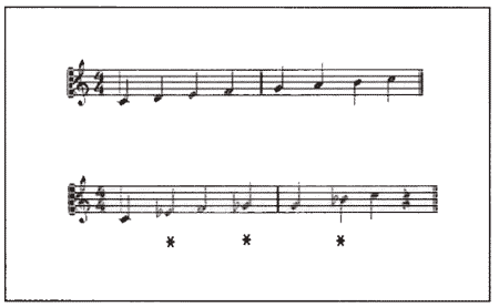 Bild 1. Die Blues-Tonleiter (unten) im Vergleich zur normalen C-Dur-Tonleiter. Die Blue-Notes sind durch Sternchen markiert.