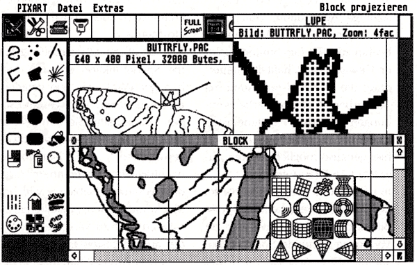 Ein paar zusätzliche Kniffe schüttelt der Pixelmeister mit den Blockoperationen aus dem Ärmel. Im eigenen Fenster lassen sich die Ausschnitte mit sehr guter Qualität skalieren und stufenlos drehen. Hinzu kommt die Blockprojektion auf verschiedene (Netz)objekte. Schade, daß hier das GEM-Klemmbrett keine Unterstützung findet. Der Einsatz von Signum!2-Fonts rundet das Bild der Gestaltungsmöglichkeiten ab.