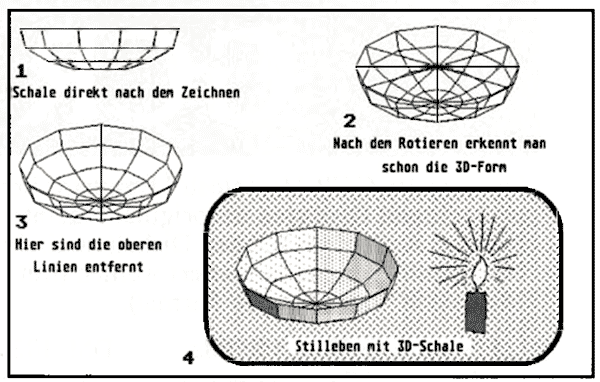 Für einen Rotationskörper berechnet das Programm aus der Umrißzeichnung und der Angabe einiger Werte einen fertigen dreidimensionalen Körper, der sich in allen drei Achsen drehen läßt. Mit dieser Funktion erzeugen Sie beispielsweise einen schmuckvollen Kerzenleuchter und binden ihn, in die passende Lage gedreht, in ein Stilleben im normalen Zeichenteil ein. Die Konstruktion solcher Rotationskörper ist einfach, und man erzielt schnell ein befriedigendes Ergebnis. Starten Sie STAD und wechseln Sie per Klick auf das »3-D« in der Menüzeile in den 3-D-Teil. Ein Druck auf die Leertaste überwindet die Meldung »Sorry, no object«, und die dritte Dimension liegt vor Ihnen. Wählen Sie unter dem Menüpunkt »Edit« den Befehl »Rotationskörper« und vergeben Sie einen Namen für das geplante Objekt. Diese Namen sind für STAD unverzichtbar, um mehrere Objekte zu unterscheiden. Auf dem Bildschirm erscheint ein Achsenkreuz. Setzen Sie per Linksklick einige Punkte in das Bild. Versuchen Sie dabei, die rechte Silhouetten hälfte einer einfachen Obstschale zu formen. Fünf Punkte ergeben schon eine brauchbare Form. Ein Klick auf die rechte Maustaste beendet die Konstruktionsarbeit, und STAD berechnet sofort eine dreidimensionale Schale aus diesem Linienzug. Haben Sie alles geschafft, sieht die Form auf Ihrem Bildschirm etwa so aus, wie Teilbild 1 im ersten Bild.