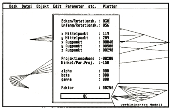 Der 3D-Teil bietet noch eine Reihe von Einstellungen, die unterschiedliche Ergebnisse bewirken. So gibt es die Funktion »Hidden Line«, die versteckte Linien sofort ausblendet. Sie arbeitet bei komplexeren Gebilden nicht immer korrekt, gibt aber gute Anhaltspunkte für die Nachbearbeitung. Wichtig für die differenzierte Gestaltung sind die Einstellungen unter »Parameter« und »Verändern«. Bild 2 zeigt die entsprechende Dialogbox. In der ersten Zeile geben Sie die Zahl der Linien an, die STAD für die Konstruktion des Objektes verwendet. Die zweite Zeile bestimmt den Kreisausschnitt. In den Zeilen 3 und 4 legen Sie den Schnittpunkt des Achsenkreuzes bei der Konstruktion fest. Das große Objekt im Bild entstand mit den gezeigten Einstellungen: 30 Linien, 56 Grad Kreisausschnitt und verschobenes Achsenkreuz. Es wäre sonst unmöglich gewesen, den weit nach rechts ausladenden Flügel zu zeichnen. Unten einmontiert sehen Sie das Objekt stark verkleinert und in einem etwas anderen Rotationsgrad. Der »Faktor« gibt übrigens die Größe des Objektes an. Er läßt sich jederzeit verändern. Die kleine Version des Objekts entstand einfach durch Ändern in Faktor 75.