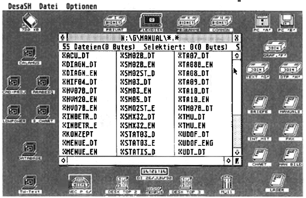 Auf der Suche nach einer komfortableren Benutzeroberfläche stößt Illing zuerst auf »Gemini« Allerdings stört ihn, daß bei diesem GEM-Ersatz »alles so fix vorgegeben ist. Man kann ja nur die Icons ändern und den CLI aufrufen - das war's«. Durch Zufall fällt ihm die auf zehn Disketten ausgelieferte »DesaShell« in die Hände, die »jede denkbare Manipulation und Einstellung zuläßt.« Er strickt die DesaShell für seine Zwecke um, so daß von jedem vernetzten Arbeitsplatz bequemer Zugriff auf sämtliche Programme und Peripheriegeräte möglich ist. »Erstaunlich, was die Programmierer mit dieser Shell geleistet haben. Ohne die DesaShell hätte ich unser Netzwerk nie in einer vergleichbaren Form aufbauen können«, lobt Illing sein liebstes Kind.