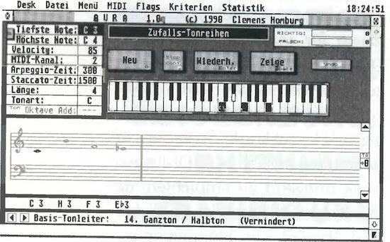 Das »Education System« von C-Lab ist dagegen völlig anders aufgebaut, auch wenn es vergleichbare Ziele anstrebt. Das Gesamtsystem besteht aus den drei Programmen »Aura«, »Midia« und »Alpha«. Aura ist ein »universelles Gehörbildungs- und Rhythm ustrainingsprogramm«. Es umfaßt die Bereiche Intervalle, Akkorde, Tonleitern, Zufallsreihen und Rhythmusübungen. Bei Midia handelt es sich um ein MIDI-Lern- und -Analyseprogramm, das den Anwender spielerisch mit den Geheimnissen von MIDI vertraut macht.