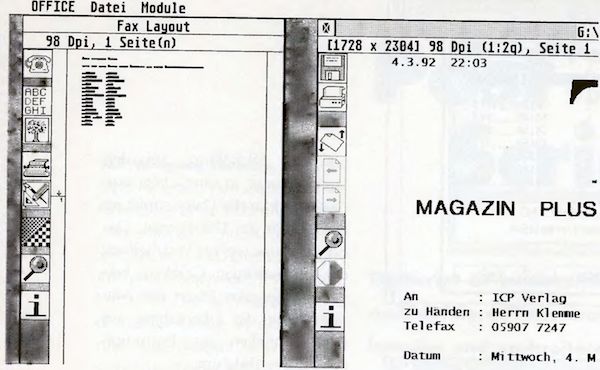 Wie schon erwähnt, wird neben Junior Office der Treiber als Zusatzprogramm mitgeliefert und läuft normalerweise als Accessory. So läßt sich auch der automatische Empfang einstellen. Anwender mit Diskettenlaufwerk sollten den Empfang in eine RAM-Disk legen, da wegen der hohen Zugriffszeit der Floppys das Fax unleserlich wird. Für diejenigen, die das Fax noch schwarz auf weiß brauchen, steht auch eine Druck-Funktion per GDOS zur Verfügung.