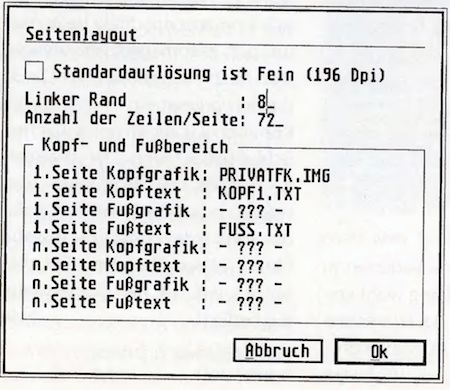 Vor dem ersten Start benötigt Junior Office einige Definitionen. Neben den Zugriffspfaden für Text, Grafik etc. ist die Angabe des grundsätzlichen Formats (Briefkopf, Fußzeile, usw.) erforderlich (Bild 2). Neben speziellen Angaben für die erste Seite lassen sich auch Kopf- und Fußbereich für die nachfolgenden Seiten anders bestimmen. Dem Anwender stehen hierfür Synonyme wie Zeit, Datum, Empfänger etc. zur Verfügung, die Junior Office bei Bedarf durch die entsprechenden aktuellen Daten ersetzt. Sind alle Einstellungen durchgeführt, ist die Software faxbereit. Mit dem Menüpunkt »Fax Layout« öffnen Sie das View-Fenster (vgl. Bild 1, links). In diesem Fenster bauen Sie die Ausgangstexte und -grafiken zusammen. Dabei sperrt das Programm die definierten Kopf und Fußbereiche, sodaß dort kein weiterer Text oder eine neue Grafik erscheinen.